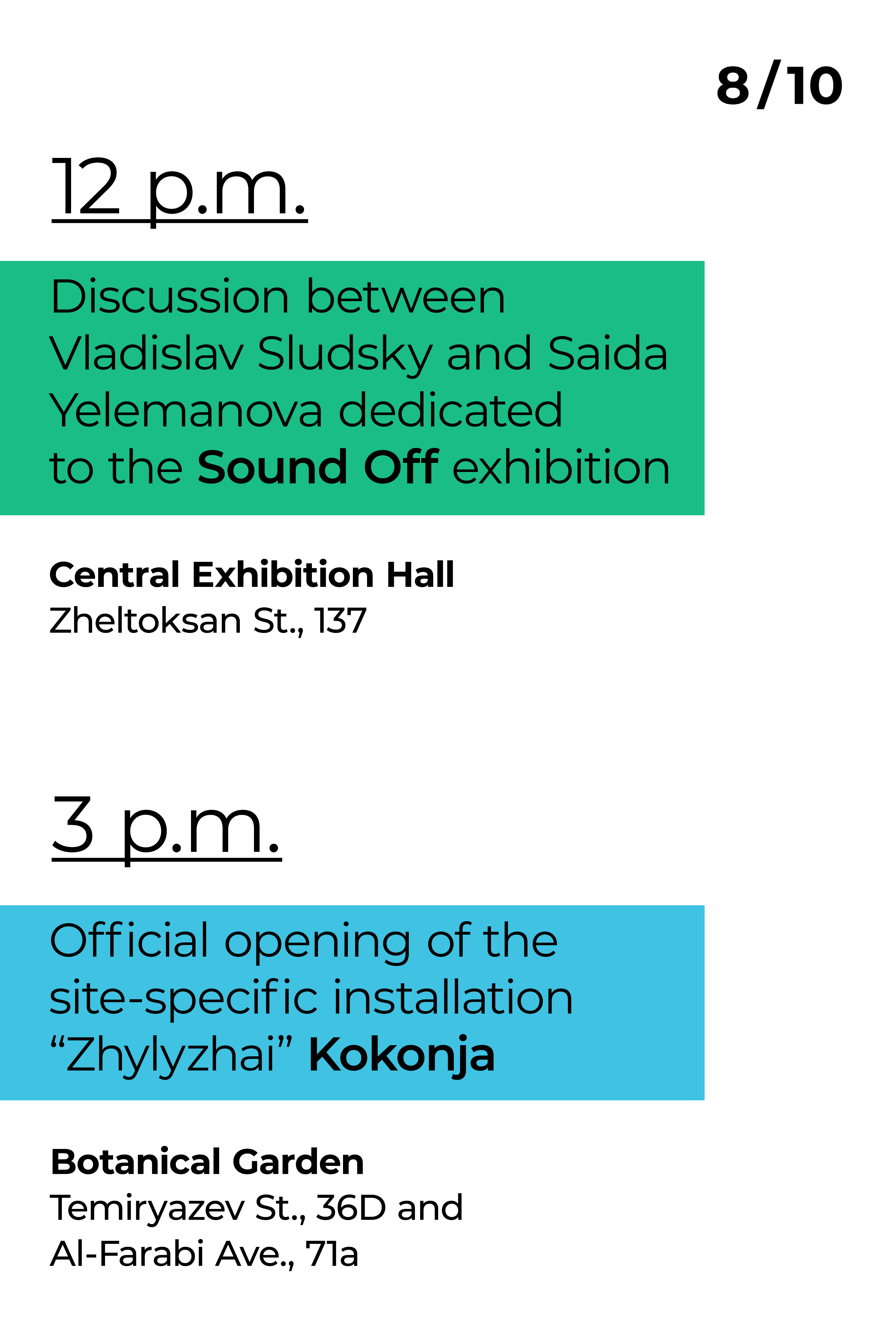 instagram. Tickets to the Sound Off exhibition and entrance ticket to Kasteev Museum, where the installations of the2vvo and Saodat Ismailova are located, can be bought online or offline at the museum ticket offices. You can visit the site-specific installation "Zhylyzhay" with an entrance ticket to the Botanical Garden -